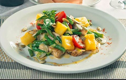 Осенний салат из тыквы, курицы, стручковой фасоли и помидоров.