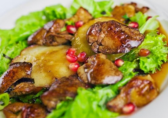 Одновременно обжарить в оливковом масле печенку до готовности. Разложить по тарелкам руколу, на нее – печенку, рядом печеные фрукты. Полить апельсиновым соком и маслом, посолить и поперчить. Подавать немедленно.